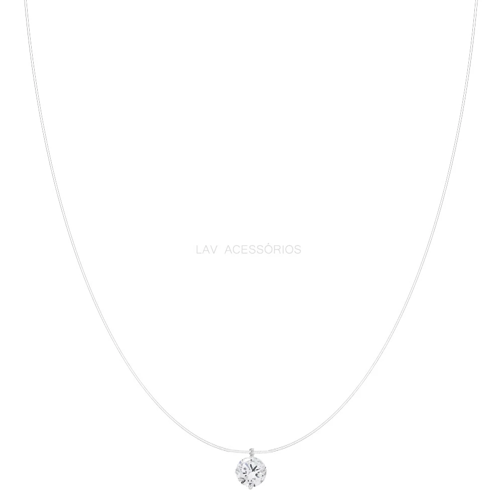 Peça em fio de nylon transparente, detalhes em prata 925, banho de rodio e pedra moissanite cravejada.