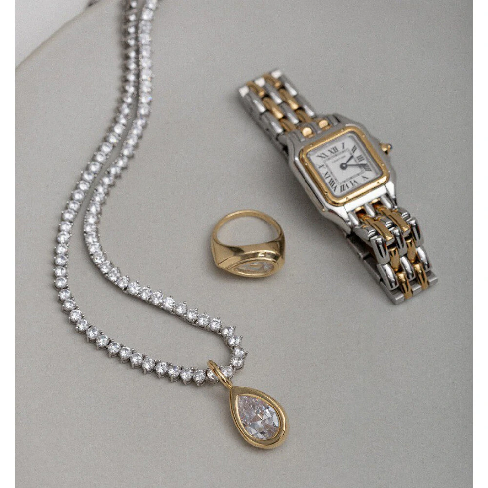 Peça em liga metálica, banho de ouro 18k e zirconia cravejada.