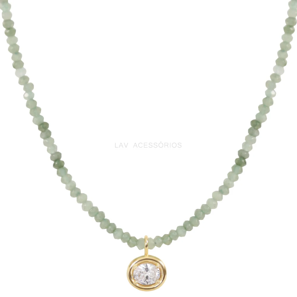 Peça feita em jades naturais, com detalhes em liga metálica, banho de paládio e ouro 18k, pingente em zirconia.